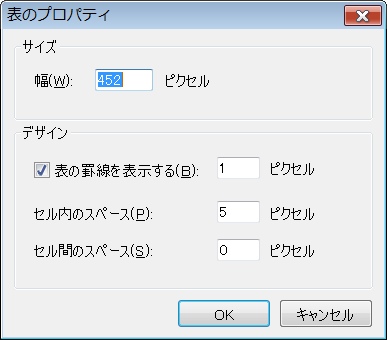 ここで表の幅を452ピクセル、セル内のスペースを5ピクセルにすると
