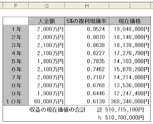 | | 入金額 | 5%の複利現価率 | 現在価格 |