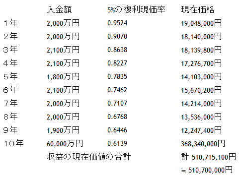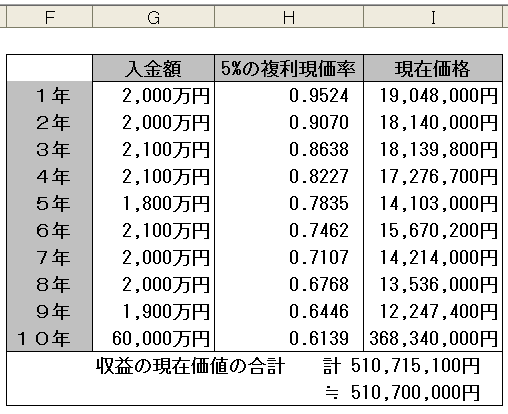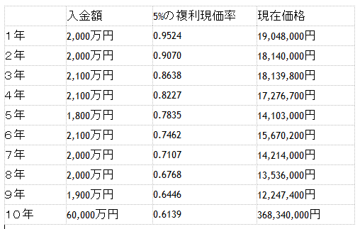 | 入金額 | 5%の複利現価率 | 現在価格 | |