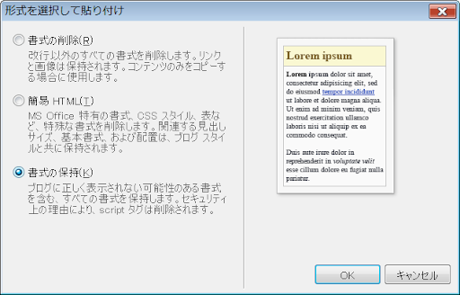 Live Writerの「編集/形式を選択して貼り付け」をクリックし、「書式の保持」を選択